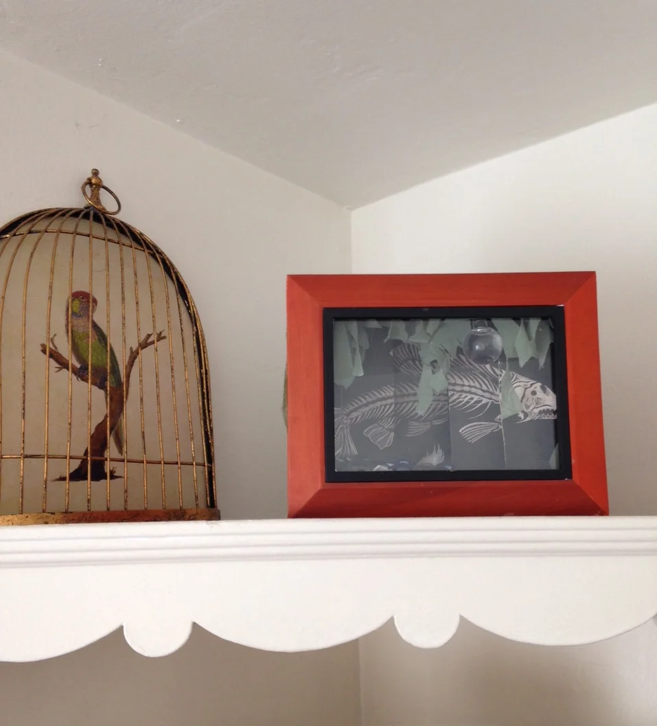 Scratchboard, fabric, glue, glass beads, shells, wood. 2007